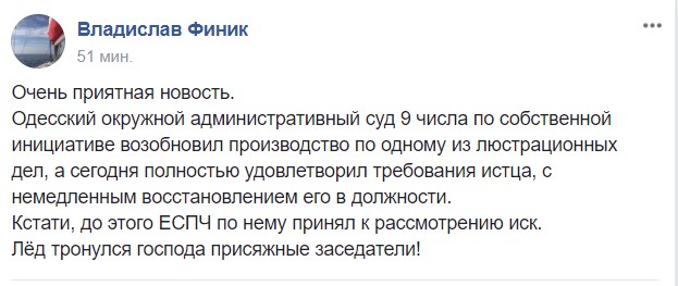 "Одесский окружной административный суд 9 числа по собственной инициативе возобновил производство по одному из люстрационных дел, а сегодня полностью удовлетворил требования истца, с немедленным восстановлением его в должности. Кстати, до этого ЕСПЧ по нему принял к рассмотрению иск", - написал Финик.