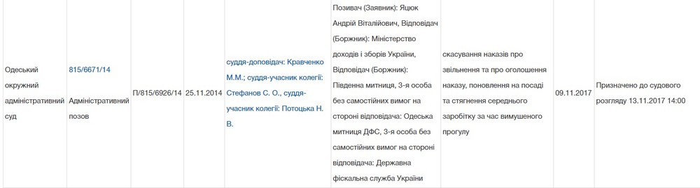 При этом, как указано на сайте "Судебной власти", 9 ноября 2017 года Одесский окружной админсуд вернулся к рассмотрению иска уволенного таможенника.