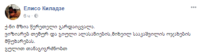 "Госпожа Мзия Церетели скончалась. Соболезную семьям Темури и Гиули Аласания, Михеила Саакашвили", - написала она. Позже в комментариях к своему посту она уточнила, что женщина скончалась ночью.