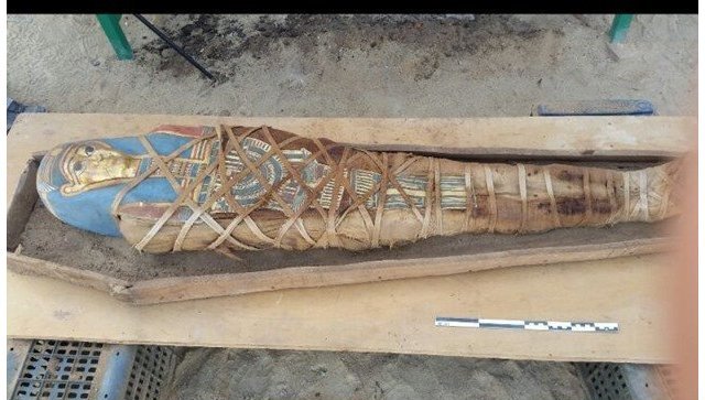 "Мумия находится в хорошем состоянии, и ее льняной погребальный саван не был поврежден. Ее голова закрыта маской из спрессованного папируса, покрытой позолотой и синей краской, на которой изображен бог неба Кхебр, а грудь мумии украшена образом богини Исиды", - заявил Мустафа Вазири, глава Высшего совета Египта по делам древностей.