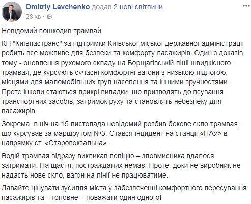 В ночь на среду, 15 ноября в Киеве хулиган повредил скоростной трамвай маршрута №3 на Борщаговской линии. Об этом в Facebook сообщил генеральный директор КП "Киевпастранс" Дмитрий Левченко.