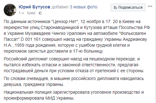 "Российский дипломат совершил наезд на пешеходном переходе, и пытался избежать огласки, предлагая пострадавшей деньги при условии отказа от претензий с ее стороны", - утверждает Бутусов.