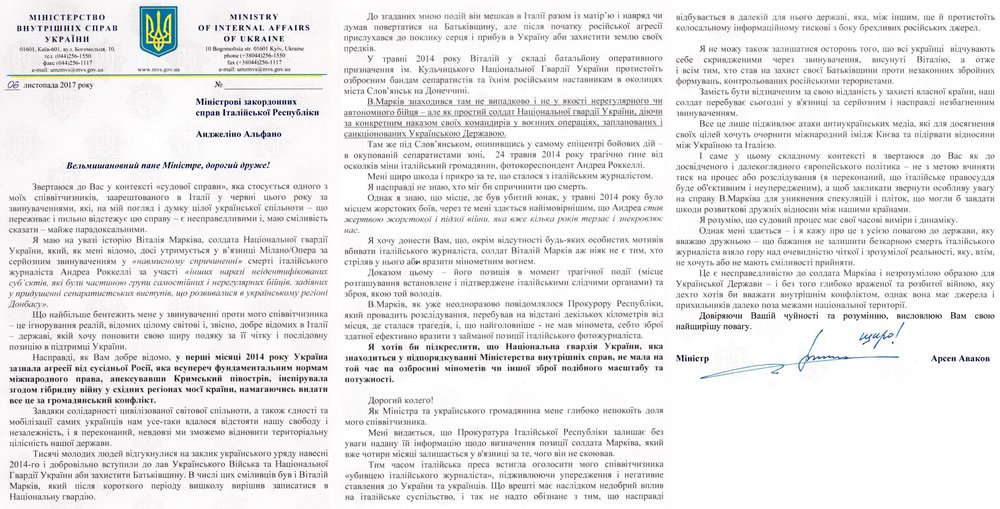 Аваков написал письмо в Италию с просьбой "объективно судить" военного Маркива