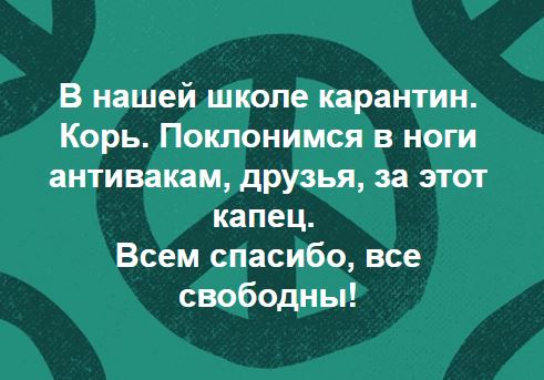 "В нашей школе карантин. Корь. Поклонимся в ноги антивакам, друзья, за этот капец. Всем спасибо, все свободны!", - написала она.