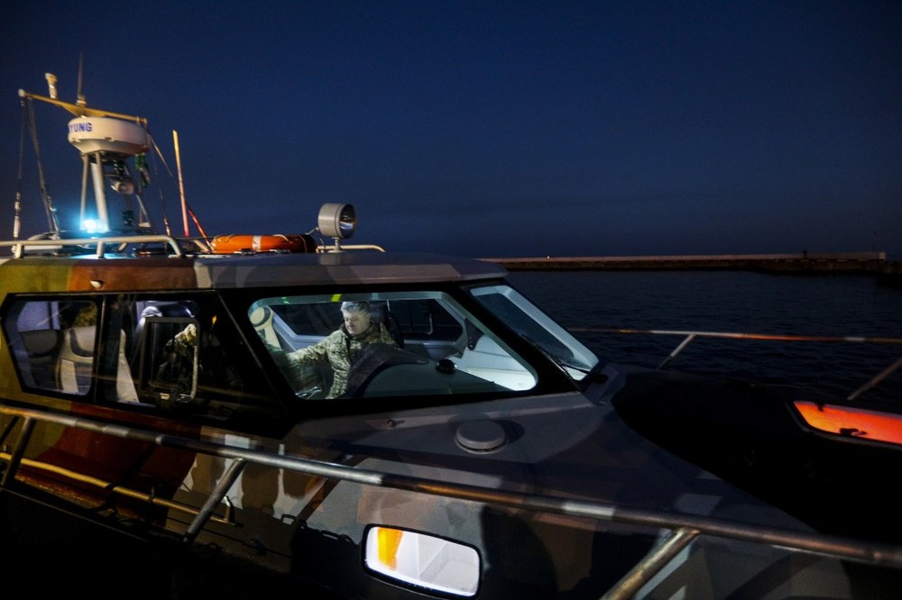 Порошенко как Верховный Главнокомандующий ВС Украины вместе с начальником Генштаба Виктором Муженко, председателем Государственной пограничной службы Петром Цигикало, заместителем Главы АПУ Валерием Кондратюком и советником президента Виктором Назаренко поднялся на борт катера и осуществил выход в открытое море.