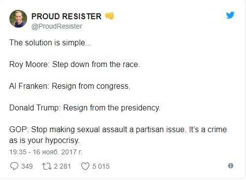 "Решение простое. Рой Мур: уходи с предвыборной гонки. Эл Франкен: увольняйся из Конгресса. Дональд Трамп: уйди с президентского поста", – говорится в твите.