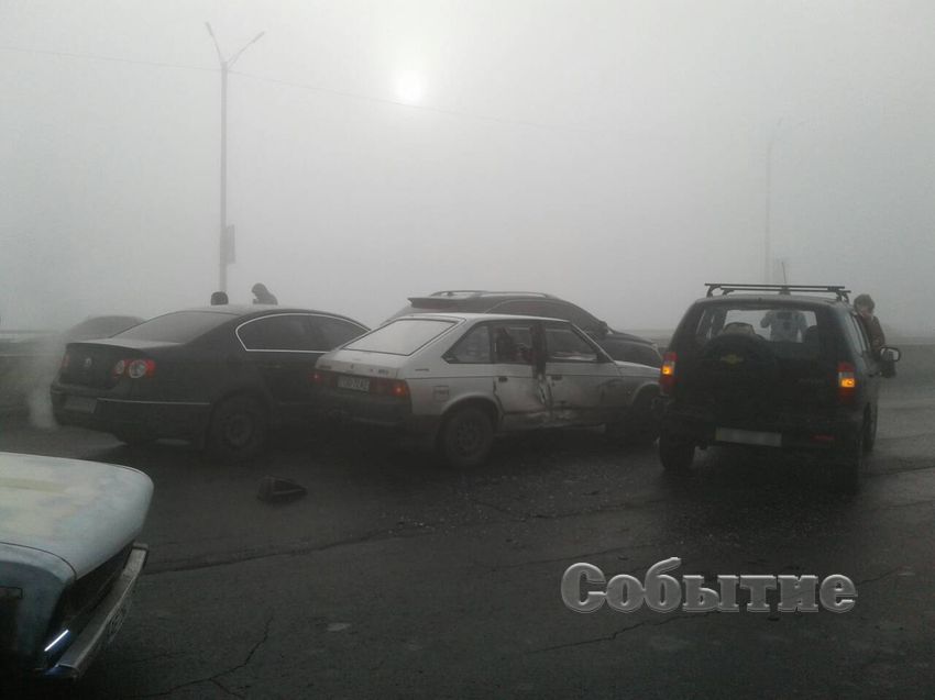 Из-за ДТП проезд по мосту ограничен, здесь образовалась пробка. Полицейские выясняют подробности ДТП, водители в замешательстве, из-за плохой видимости некоторые путаются в показаниях.