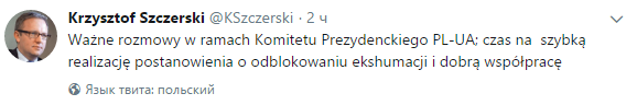 "Важный разговор в рамках польско-украинского президентского комитета; пришло время для быстрой реализации решения о разблокировании эксгумации и улучшения сотрудничества", - написал он на своей странице в Твиттер в пятницу.