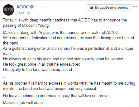 "Сегодня с глубокой печалью в сердце AC/DC должен объявить о смерти Малкольма Янга.