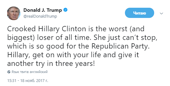 "Жуликоватая Хиллари Клинтон самая худшая (и большая) неудачница всех времен. Она просто не может остановиться, что очень хорошо для республиканской партии. Хиллари, продолжай жить своей жизнью и попытайся снова через три года" - написал Трамп.