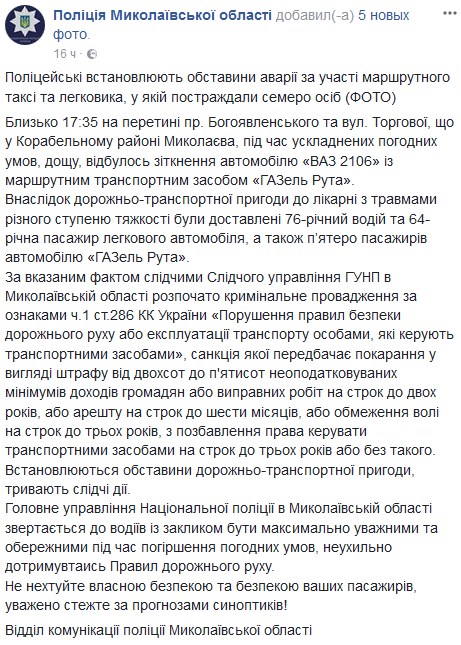 По данному факту следователями Следственного управления ГУНП в Николаевской области начато уголовное производство по признакам ч. 1 ст. 286 УК Украины "Нарушение правил безопасности дорожного движения или эксплуатации транспорта лицами, которые управляют транспортными средствами".
