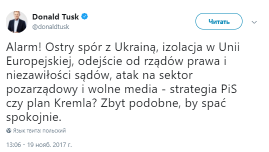 "Тревога! Острый спор с Украиной, изоляция в Европейском Союзе, отход от верховенства права и независимости судов, нападки на негосударственный сектор и свободные медиа - стратегия ПиС или план Кремля? Очень похоже, чтобы спать спокойно", - написал он.