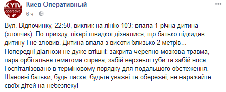 Инцидент произошел в Святошинском районе столицы на улице Отдыха. На линию "103" поступил вызов, что с высоты около 2 метров упал годовалый мальчик.