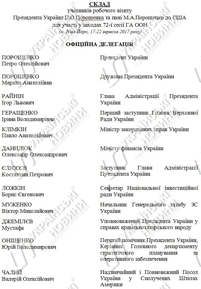 В число участников рабочего визита в США 17-22 сентября 2017 года президента Петра Порошенко был включен 31 человек – члены официальной делегации и сопровождающие лица (без учета личной охраны).