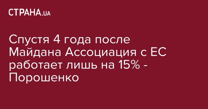 Соглашение об ассоциации между Украиной и Европейским Союзом, ради которого в свое время собрался Евромайдан, спустя 4 года после революции выполнено лишь на 15%. Об этом сказал Петр Порошенко во время рабочей поездки в Днепропетровскую область, передает УНН.