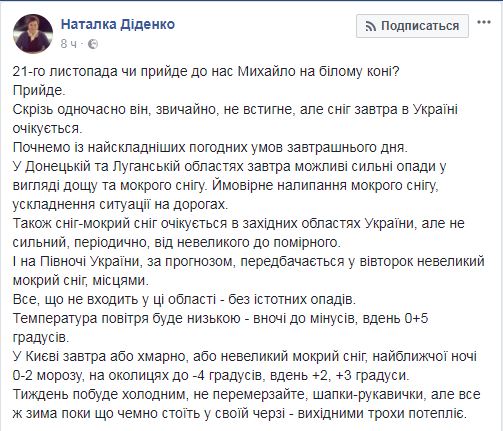 "Придел ли к нам Михаил на белом коне?", - пишет Диденко, подразумевая, что 21 ноября большой праздник - Собор Архистратига Михаила и прочих Небесных Сил. И пишет, что придет, то есть начнется снегопад.