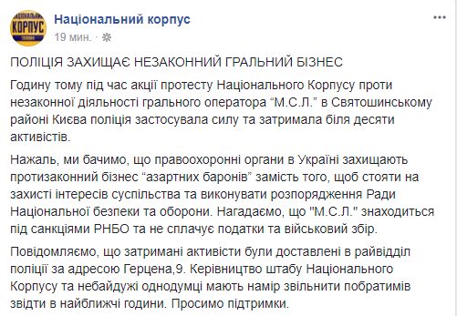 "Это активисты национальных дружин (Азов), которые борются с незаконными казино и игровыми залами. Как оказалось, полиция заинтересована в их работе. По нашей информации задержанных доставили в Шевченковский райотдел на Герцена 9, сейчас мы будем ехать туда" - сообщил лидер киевского "Азова" Назар Кравченко.