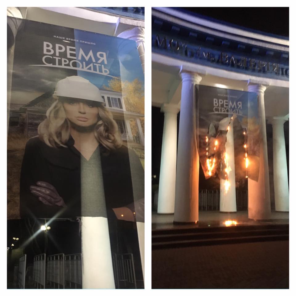 На баннере была изображена телеведущая и супруга представителя Украины на переговорах в Минске по урегулированию в Донбассе Виктора Медведчука Оксана Марченко.