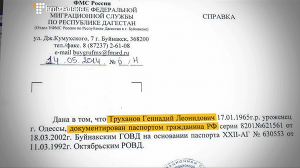Позже за тему взялись центральные СМИ Украины, которые опубликовали номер и серию "российского паспорта", который был выдан Труханову в Буйнакске (Россия) в 2002 году.