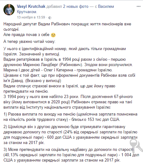 Не так давно блогер Василий Крутчак (у него с Рабиновичем острый конфликт - политик обвиняет его в организации покушения на себя, а Крутчак Рабиновича - в мести за критические публикации) опубликовал копии документов из МВД Израиля, где Рабинович якобы зарегистрировался еще в 1994 году, когда репатриировался вместе с женой. Потом ей и детям дали гражданство, автоматически израильский паспорт выдали и Рабиновичу. Причем, если верить блогеру, в новом гражданстве Рабинович принял имя Давид.