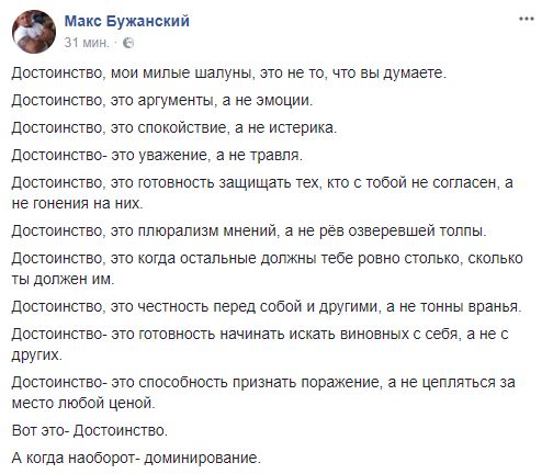 "Достоинство - мои милые шалуны, это не то, что вы думаете. Достоинство – это аргументы, а не эмоции. Достоинство – это спокойствие, а не истерика. Достоинство – это уважение, а не травля. Достоинство – это готовность защищать тех, кто с тобой не согласен, а не гонения на них. Достоинство – это плюрализм мнений, а не рёв озверевшей толпы. Достоинство – это когда остальные должны тебе ровно столько, сколько ты должен им. Достоинство, это честность перед собой и другими, а не тонны вранья. Достоинство – это готовность начинать искать виновных с себя, а не с других. Достоинство – это способность признать поражение, а не цепляться за место любой ценой. Вот это- Достоинство. А когда наоборот- доминирование".