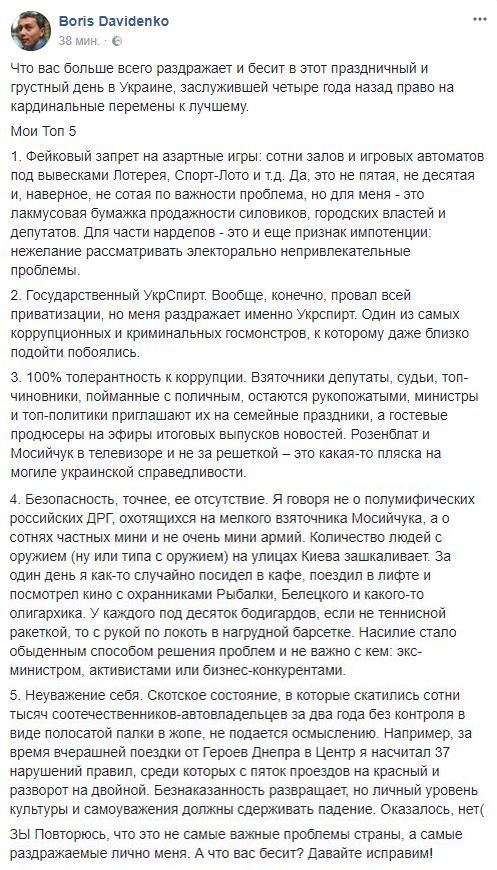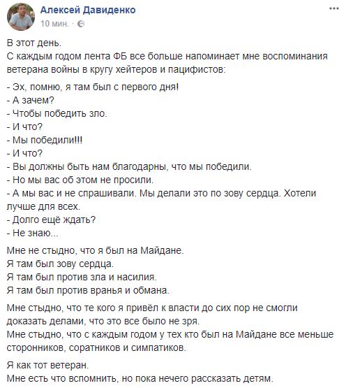 Предприниматель и участник Майдана Алексей Давиденко делится своим отношением к событиям 4-летней давности: "С каждым годом лента ФБ все больше напоминает мне воспоминания ветерана войны в кругу хейтеров и пацифистов: