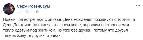 "Новый Год встречают с оливье, День Рождения празднуют с тортом, а День Достоинства отмечают с чаем-кофе, хорошим настроением и тепло одетым под зонтиком, но уже без друзей, потому что друзья теперь живут в других странах".