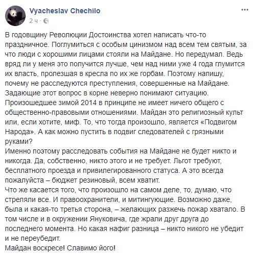 "В годовщину Революции Достоинства хотел написать что-то праздничное. Поглумиться с особым цинизмом над всем тем святым, за что люди с хорошими лицами стояли на Майдане. Но передумал. Ведь вряд ли у меня это получится лучше, чем над ними уже 4 года глумится их власть, пролезшая в кресла по их же горбам. Поэтому напишу, почему не расследуются преступления, совершенные на Майдане.
