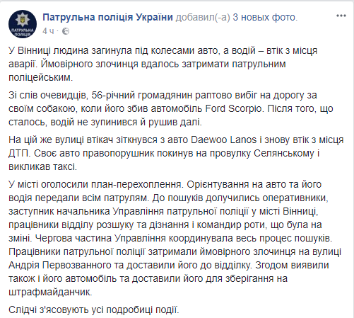 В Виннице мужчина внезапно выбежал на шоссе за собакой и его насмерть сбила машина. Об этом сообщает пресс-служба Патрульной полиции в Facebook.