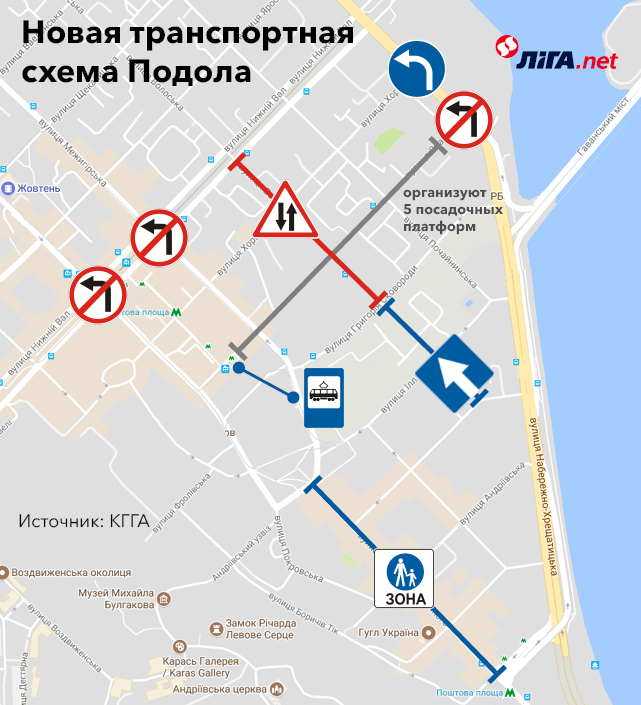Вдоль гостиницы Fairmont до улицы Игоревской - сделают проезд. С улице Набережно-Крещатицкой запретят левый поворот на улицу Спаскую, разрешает левый поворот на улицу Хорыва. На улице Волошской на отрезке от улицы Верхний Вал до улицы Сковороды откроют двухстороннее движение.