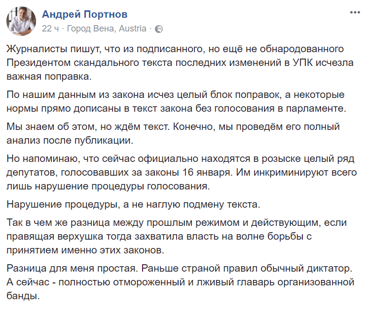 "По нашим данным из закона исчез целый блок поправок, а некоторые нормы прямо дописаны в текст закона без голосования в парламенте. Мы знаем об этом, но ждём текст. Конечно, мы проведём его полный анализ после публикации", - написал Портнов в Facebook.