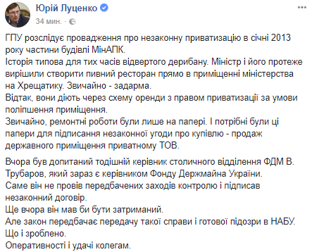 "Министр и его протеже решили создать пивной ресторан прямо в здании министерства на Крещатике. Конечно - даром. Следовательно, они действуют через схему аренды с правом приватизации при условии улучшения помещения. Конечно, ремонтные работы были только на бумаге. И нужны были эти бумаги для подписания незаконной сделки о купле - продаже государственного помещения частному ООО", - написал Луценко.