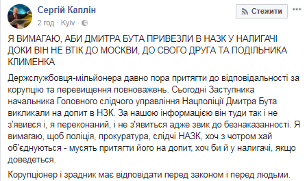 Госслужащего-миллионера давно пора привлечь к ответственности за коррупцию и превышение полномочий. Сегодня заместителя начальника Главного следственного управления Нацполиции Дмитрия Бута вызвали на допрос в НАПК. По нашей информации он туда так и не явился, я убежден, что и не появится - ведь привык к безнаказанности. Я требую, чтобы полиция, прокуратура, следственные НАПК, хоть с чертом пусть объединяются - должны привлечь его на допрос, хотя бы и в веревке, если придется. Коррупционер и предатель должен отвечать перед законом и перед людьми", - написал Сергей Каплин.