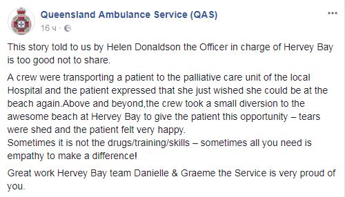 Сотрудники скорой медицинской помощи австралийского города Харви-Бей везли смертельно больную пациентку в отделение паллиативного ухода в местной больнице, когда женщина сказала им, что она хотела бы еще раз побывать на пляже. И врачи выполнили ее пожелание, заехав по пути на пляж и показав ей океан.