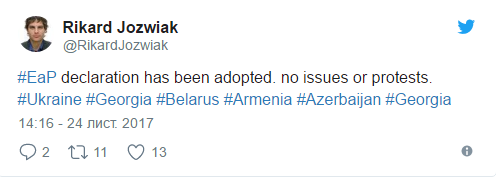При этом журналист  Рикард Йозвяк в Twitter сообщил, что декларация Восточного партнерства была принята без каких вопросов.