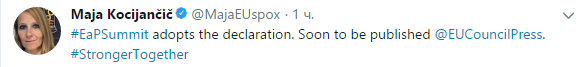 "Саммит "Восточного партнерства" принял декларацию. Скоро она будет опубликована на сайте Евросовета", - сообщила она.