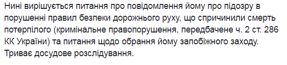 Ему готовятся объявить подозрение в нарушении правил безопасности дорожного движения, повлекшее смерть потерпевшего (уголовное правонарушение, предусмотренное ч. 2 ст. 286 УК Украины), а также - избрать меру пресечения.
