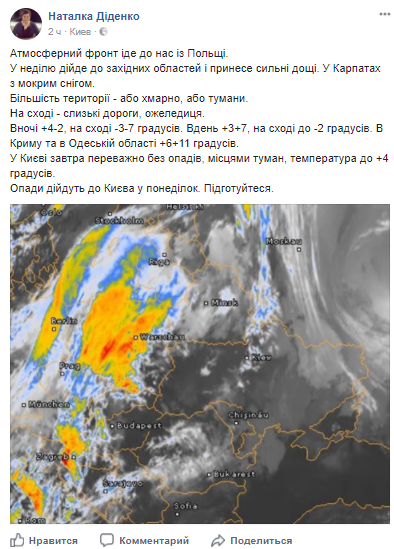 В воскресенье, 26 ноября, по прогнозам синоптиков атмосферный фронт обусловит дождь и мокрый снег, в некоторых регионах будет туман. Температура в столице поднимется до +5 градусов. Об этом сообщила синоптик Наталья Диденко в Facebook.