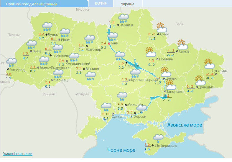 В понедельник, 27 ноября, на большей территории Украины обещают дождь со снегом. Без осадков только на востоке. Там сегодня днем установится минусовая температура. Об этом говорит прогноз Укргидрометцентра.