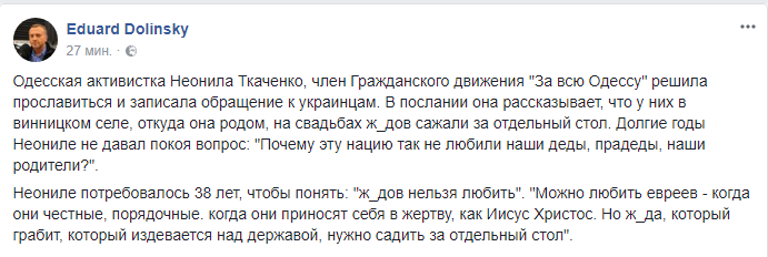 В своем послании Ткаченко рассказывает, что в винницком селе, откуда она родом, на свадьбах евреев сажали за отдельный стол и долгие годы она не могла понять, почему так происходило, "почему эту нацию так не любили наши деды, прадеды, наши родители?". И вот она поняла и решила поделиться "мудростью" с украинцами.