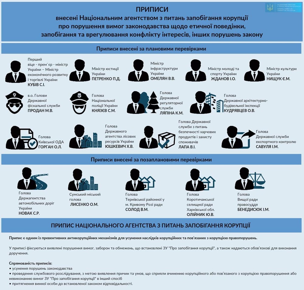 Так, предписания вынесены первому вице-премьер-министру Украины - министру экономического развития и торговли Украины Степану Кубиву, министру юстиции Павлу Петренко, министру инфраструктуры Владимиру Омеляну, министру молодежи и спорта Игорю Жданову, министру культуры Евгению Нищуку, и.о. председателя Государственной фискальной службы Мирославу Продану, председателю Нацполиции Сергею Князеву и другим.