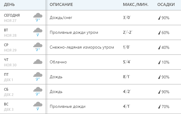 Сайт Weather.com обещает осадки практически всю неделю. В понедельник и среду со снегом. Также 30 ноября утром возможна ледяная изморось. Без осадков только в четверг, 29 ноября. Дневная температура +1...+4. Самым теплым днем недели станет суббота, когда потеплеет до +8.