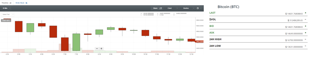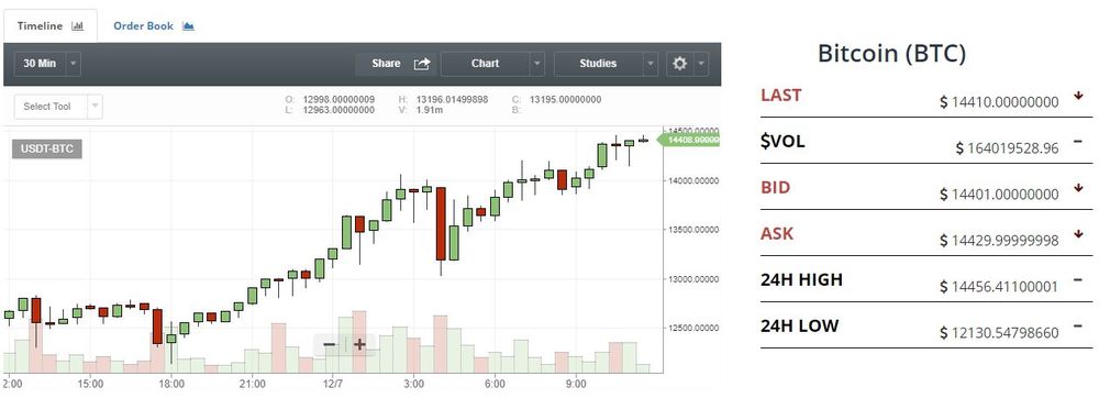 на сайте Bitrex указана цена 14 588 долларов за биткоин.