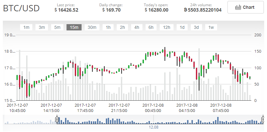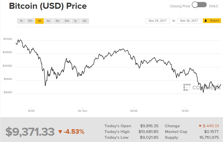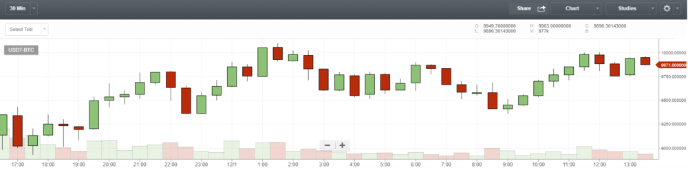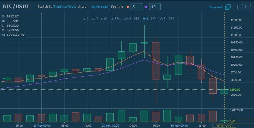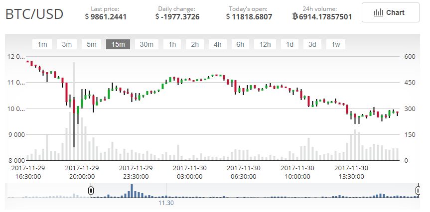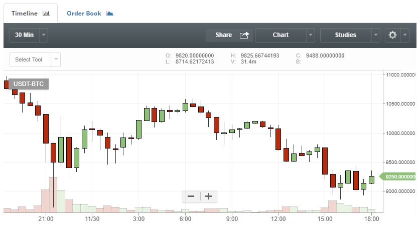 Bittrex показывал цену биткоина 9220 долларов, на графике по сравнению с утром виден значительный провал.