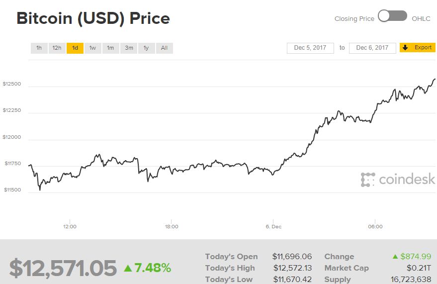 Биткоин продолжает подниматься. Утром на бирже Coindesk курс криптовалюты составил  12 571 долларов.