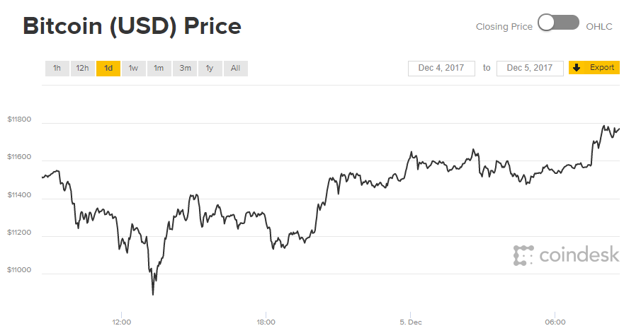 Криптовалюта уверенно продолжает расти в цене. Так, утром биржа Cоindesk показала цену в 11 770 долларов. С момента открытия биржи сегодня биткоин успел вырасти на 1,30 процента.
