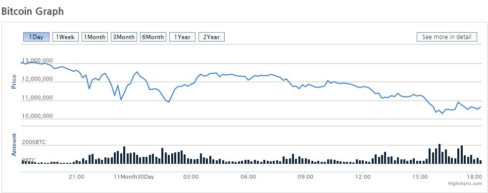 На южно-корейской бирже криптовалют Bithumb, где традиционно самый высокий спрос на биткоин, он стоил "почти 10" - 9929,23 долларов. По графику видно, что курс с утра четверга на вечер снизился.