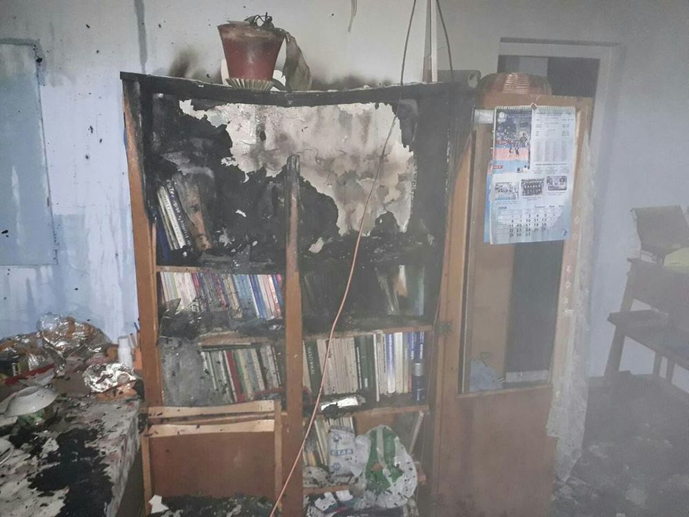 В результате пожара повреждены шкаф, закопчены стены и потолок в помещении.