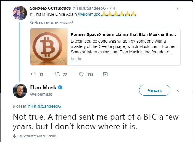 "Это неправда. Друг прислал мне несколько биткоинов пару лет назад, но я не знаю, где они находятся", - ответил Маск.