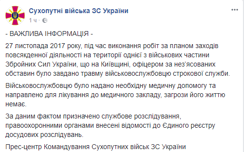 В воинской части под Киевом офицер при невыясненных обстоятельствах нанес травму военнослужащему срочной службы. Об этом сообщает пресс-служба Сухопутных войск ВСУ.